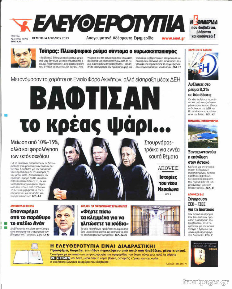 - Θα πληρώνουν πρώην χαράτσι τα κοτέτσια και οι στάνες που δεν ηλεκτροδοτούνται. Και τα αγροτεμάχια που δεν ηλεκτροδοτούνταθα πληρώνουν πρώην χαράτσι, Η ΔΕΗ υποχρεούται να βάλει ρολόγια και στα χωράφια και στα οικόπεδα και στα σκυλόσπιτα. Ρολόι της ΔΕΗ και στην ταράτσα που δεν θα ηλεκτροδοτείται πια από το κοινόχρηστο ρεύμα, αλλά από αυτόν που έχει τον αέρα.