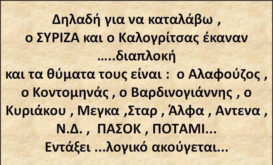 Το μεγαλύτερο έγκλημα του Τσίπρα ήταν που κατάφερε και βγήκε πρώτος σε εκλογές και σχημάτισε κυβέρνηση. Τότε θυμήθηκαν κάποιοι ότι για όλα τα κακά στη χώρα μας φταίει η Αριστερά, όπως κάποτε για όλα τα κακά στο τραγούδι έφταιγαν ο Νταλαρας και ο Μάτσας. Παιδιά, δεν είναι κακό να νικάς, έστω χωρίς επανάσταση, έστω σε αστικές εκλογές. Μόνο ο καταθλιπτικός δε μπορεί να διαχειριστεί κάτι θετικό που συμβαίνει στη ζωή του.