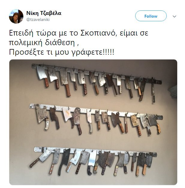 Προσέξτε. Πολλοί αναρχικοί μπαίνουν ντυμένοι πατριώτες στα λεωφορεία που φεύγουν για το συλλαλητήριο ώστε να μας σαμποτάρουν. Για να είμαστε σίγουροι ρωτάμε πάντα τον διπλανό μας πως γράφεται το "συλλαλητήριο" και αν απαντήσει σωστά δεν τον αφήνουμε να επιβιβαστεί.— Οικογενειάρχης (@oxi_mono) 18 Ιανουαρίου 2019