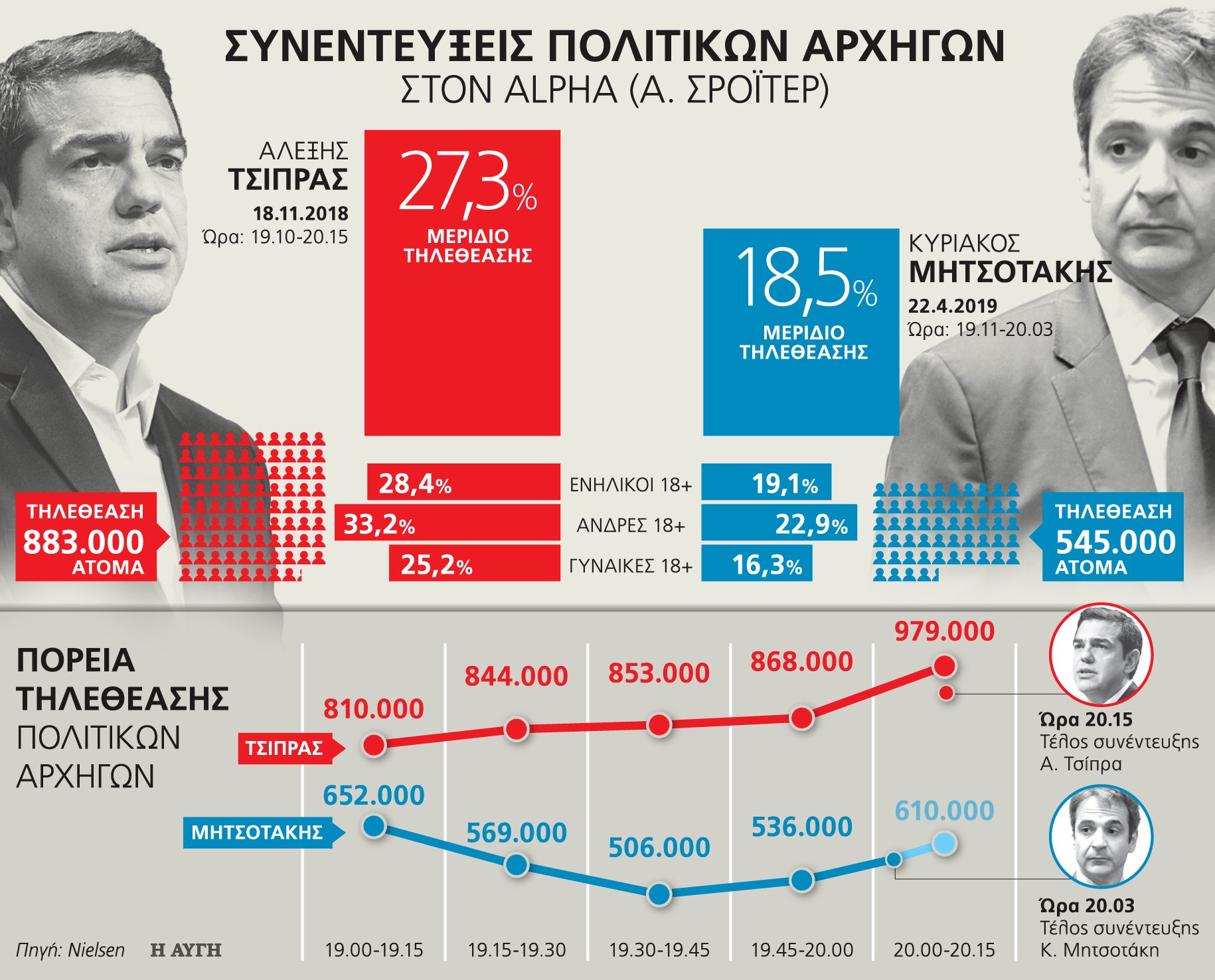 Πάει ο Μητσοτάκης στον Alpha και χαντακώνει το δελτίο ειδήσεων, στο τσακ δεν έχασε την πρωτιά από τον ΑΝΤ1. Πάει ο Τσίπρας στον ΑΝΤ1 και ανεβάζει τόσο το δελτίο που το φέρνει από 2ο στην 1η θέση,,, https://t.co/06jhDOB9ry— e-tetRadio.gr (@tetRadio) 23 Απριλίου 2019