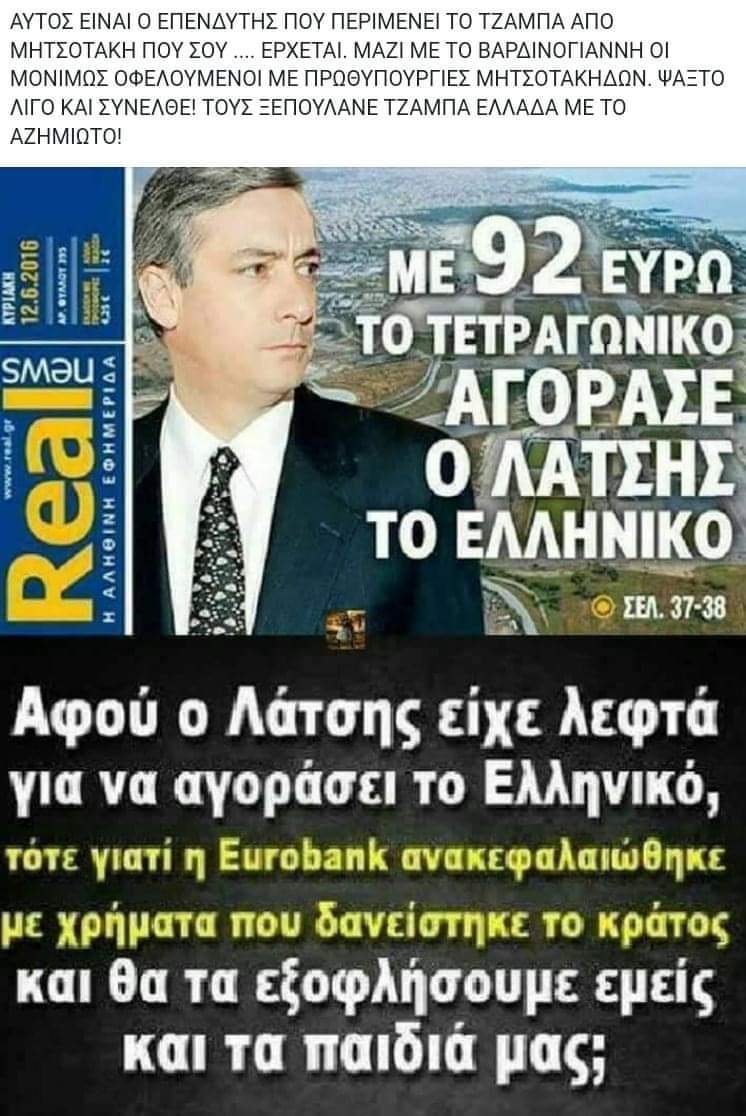 Όλα καλά με την επένδυση στο Ελληνικό. Ο Λάτσης γιος θέλει κι άλλη ευκολία: όχι μόνο να μην πληρώσει τίποτα σε κανέναν, αλλά και να τον πληρώσει το κράτος για την υπηρεσία που (θα) προσφέρει.