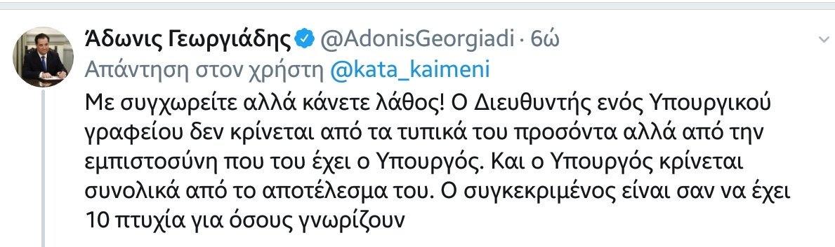 Ζούμε στιγμές που η Ελλάδα δίνει ξανά τα πνευματικά της φώτα στην ανθρωπότητα. Έχουμε πλέον αριστεία χωρίς πτυχίο. Ο Γεωργιάδης, όχι ο παιδεραστής, ο άλλος, έχει διευθυντή στο υπουργικό γραφείο του ακροδεξιό με πάνω από € 4.000 συνολικές μηνιαίες αποδοχές και απολυτήριο λυκείου.